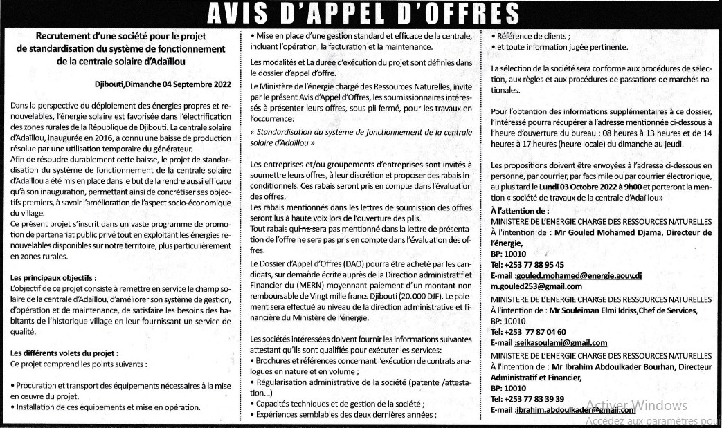 Direction de la coopération internationale, de la communication et de l'informatique 24 September 2022 Print User Rating: 5 / 5 Please Rate Vote 1 Vote 2 Vote 3 Vote 4 Vote 5 REPUBLIQUE DE DJIBOUTI MINISTERE DE L’ENERGIE CHARGE DES RESSOURCES NATURELLES Prev Next