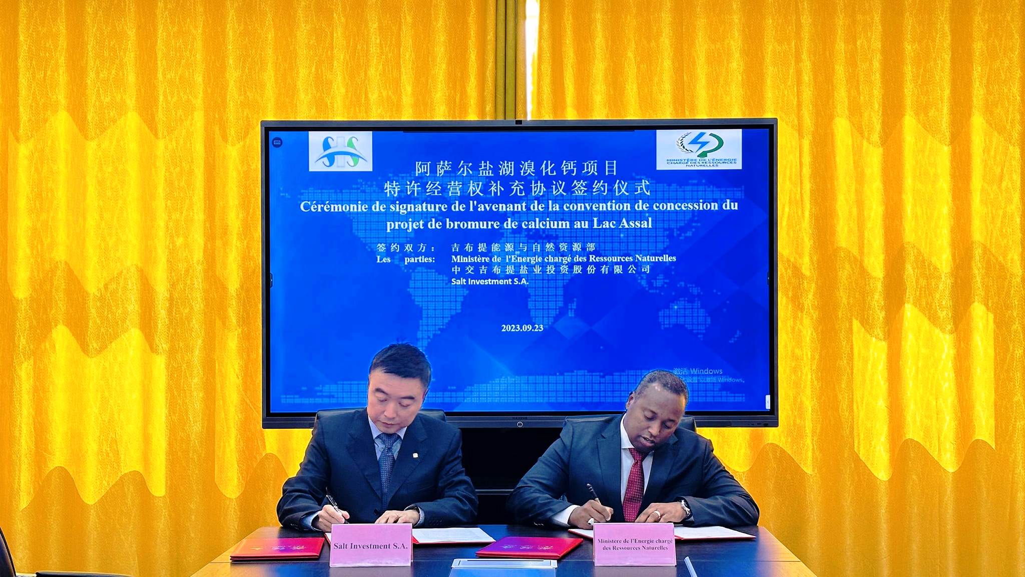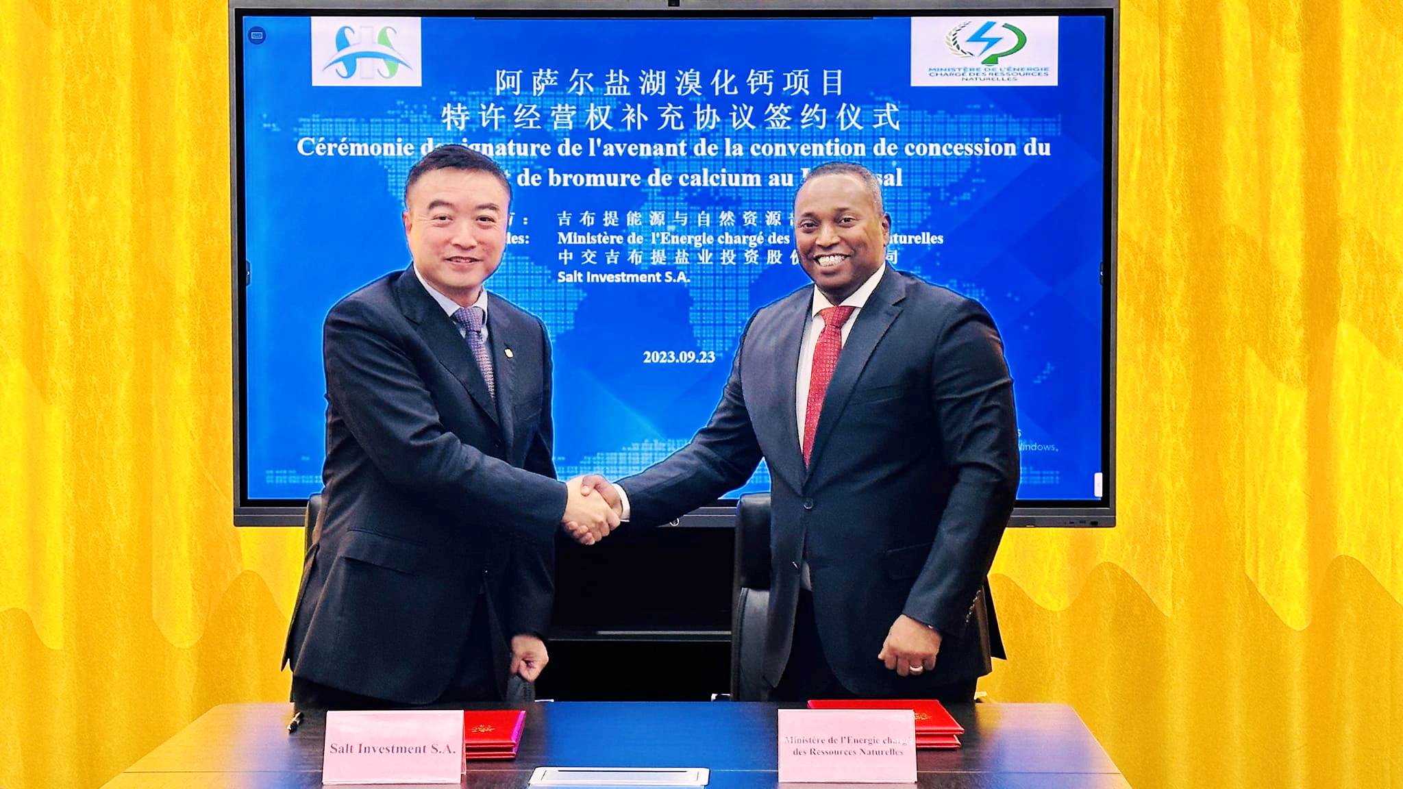 Au 2ème jour de sa mission de travail en Chine, le Ministre de l'Energie, chargé des Ressources Naturelles, Son Excellence Monsieur Yonis Ali Guedi et le Président du Conseil d'Administration et Directeur Général de la société Salt Investment SA, M. Pan Weidong, ont procédé, ce Samedi 23 Septembre 2023, dans la ville de Weifang, à la signature d'un avenant de la convention de la redevance relative à la production et à l'exportation du bromure de calcium.